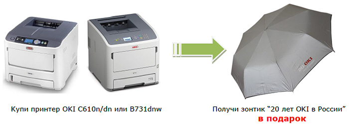 Только с 1 июня по 31 июля 2016 года* при покупке принтера OKI С610n, C610dn или B731dnw - юбилейный зонтик «20 лет OKI в России» в подарок!