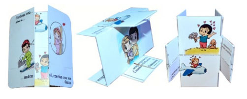 Отличительные свойства: • печать на обычном лазерном принтере; • простота в подготовке макета, печати и сборке; • оригинальное решение для рекламного носителя; • неизменно вызывает желание «листать» его и смотреть, что получится после сгибания квадрата в разных направления.;