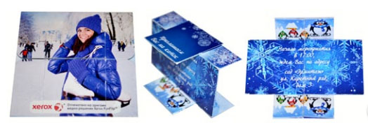 Xerox FunFlip – интерактивное четырехстороннее пространственное решение. Это лист бумаги с перфорацией и полями для вставки четырех изображений. После печати, отрыва лишней бумаги по границам перфорации и сложения получается квадрат, «ломая» который по горизонтали или вертикали можно «собрать» каждое из четырех напечатанных изображений. FunFlip – запоминающийся рекламный носитель: попав вам в руки, он неизменно вызывает желание «листать» его и смотреть, что получится после сгибания квадрата в разных направлениях. Он интересен как для продвижения отдельного продукта, так и для презентации компании. FunFlip можно использовать и в личных развлекательных целях: сделать из него пригласительный на вечеринку или мини-альбом с фотографиями близких.