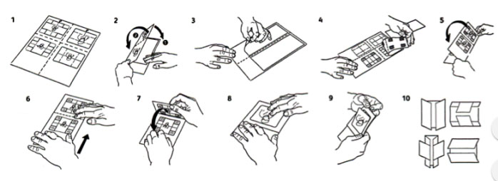 Сборка FunFlip занимает несколько секунд: 1. Напечатайте изображение 2. Сложите пополам по длинной стороне по перфорации, разогните обратно 3. Аккуратно удалите клеевые подложки и еще раз сложите лист пополам по длинной стороне 4. Надавите для лучшей склейки 5. Еще раз сложите по линии перфорации 6. Надавите для лучшей склейки 7. Выдавите изделие по периметру 8. FunFlip готов!